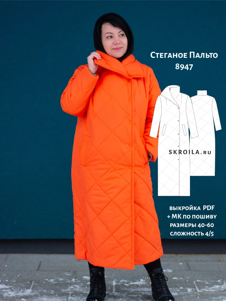Выкройка удлиненной стеганой Куртки-Пальто свободного силуэта, на подкладке. Цельнокроеный воротник стойка. Рукав одношовный втачной, длинный. По переду расположены прорезные карманы с настрочной листочкой. Нагрудные вытачки уходят в плечевой шов, как и плечевые вытачки на детали спинки. Застежка куртки-пальто на кнопки Альфа.