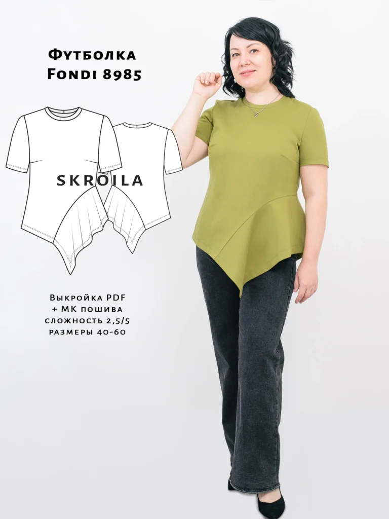Выкройка женской футболки с асимметричным притачным боковым воланом. На полочке расположены нагрудные вытачки, переведенные в боковой шов. Вырез горловины округлой формы, оформлен притачной бейкой. Короткий втачной рукав. Длина бокового шва до бедра.